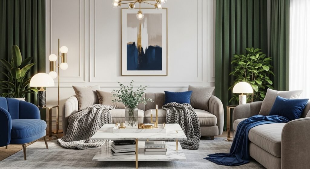 After you have a neutral base, add deeper tones in small accents—like pillows, curtains, or artwork. A navy pillow here, emerald curtains there, maybe a gold-framed mirror—small touches go a long way.